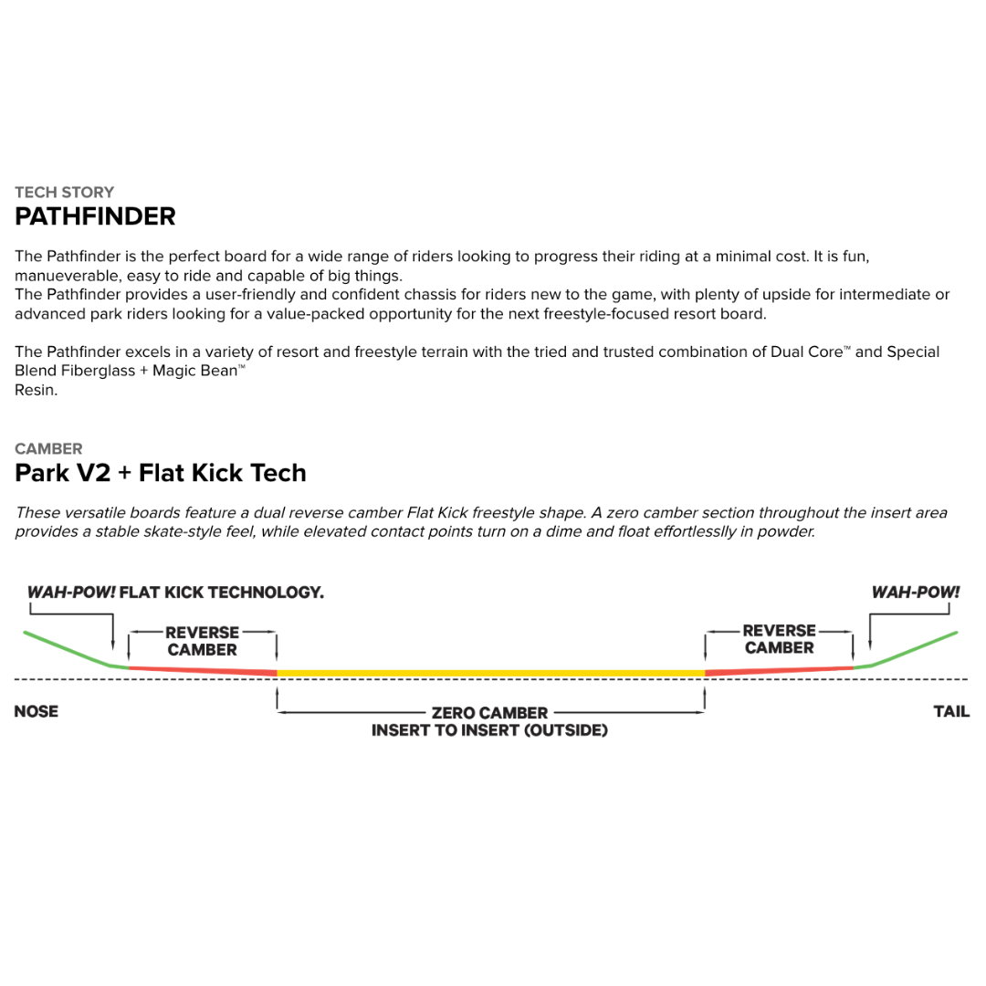 The Pathfinder provides a user-friendly and confident chassis for riders new to the game, with plenty of upside for intermediate or advanced park riders looking for a value-packed opportunity for the next freestyle-focused resort board.