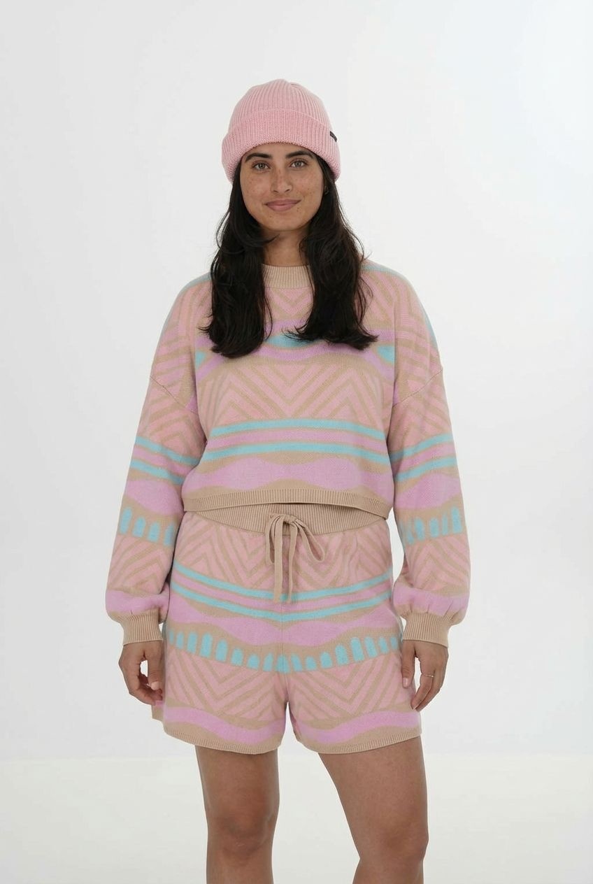 NOTICE THE RECKLESS PARADISE ISLAND SET TOPFeatures: Matching set with Paradise Island Set Short, Drop shoulder, ribbed hemColor: Sand with coral, aqua and bubblegum patternFabric component: 100% CottonFit: Oversized; Model wears MSpecific washing care: Hang to dry; Machine wash gentle cycle; Machine wash cold